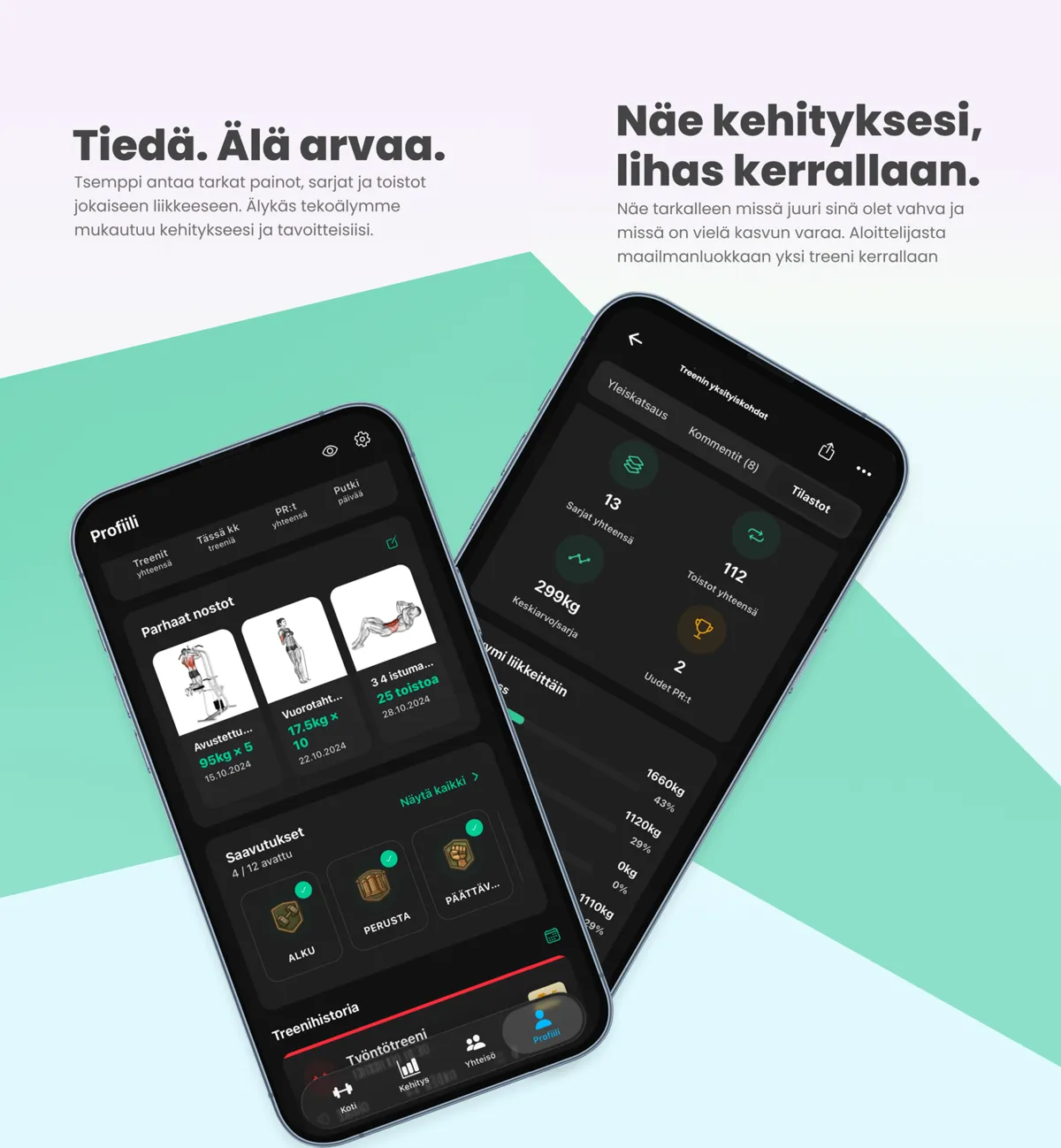 - Progressiivinen seuranta – näet konkreettisesti miten painot ja toistot kehittyvät