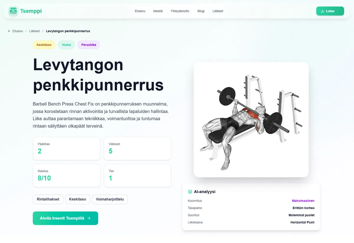 Haluatko kokeilla Suomen älykkäintä kuntosalisovellusta ilmaiseksi? Liity Tsemppiin ja saat personoidun AI-treeniohjelman joka mukautuu juuri sinun tavoitteisiisi.